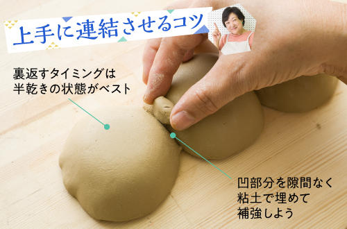 連結部分はデリケートなため、しっかりつなぎ合わせなければポキっと折れてしまうことも。裏側から粘土で補強することで、耐久性を高めます。