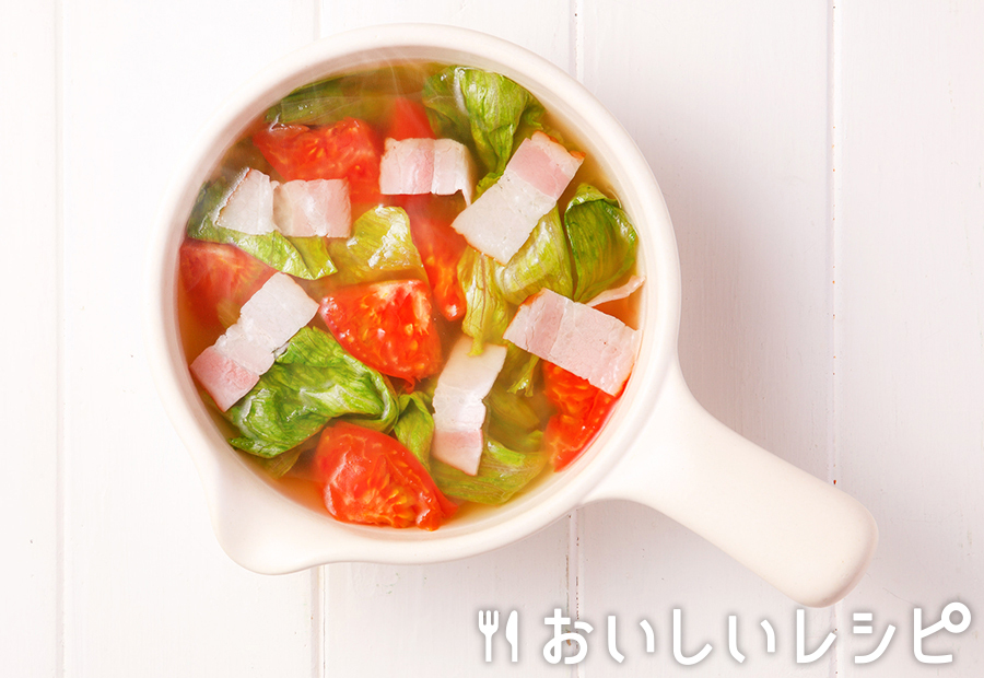 - myおかずスープ ベーコンとトマト「プチッと鍋」で手軽にmyスープ。さっぱりとした味わいの、BLT(ベーコン、レタス、トマト)スープ。