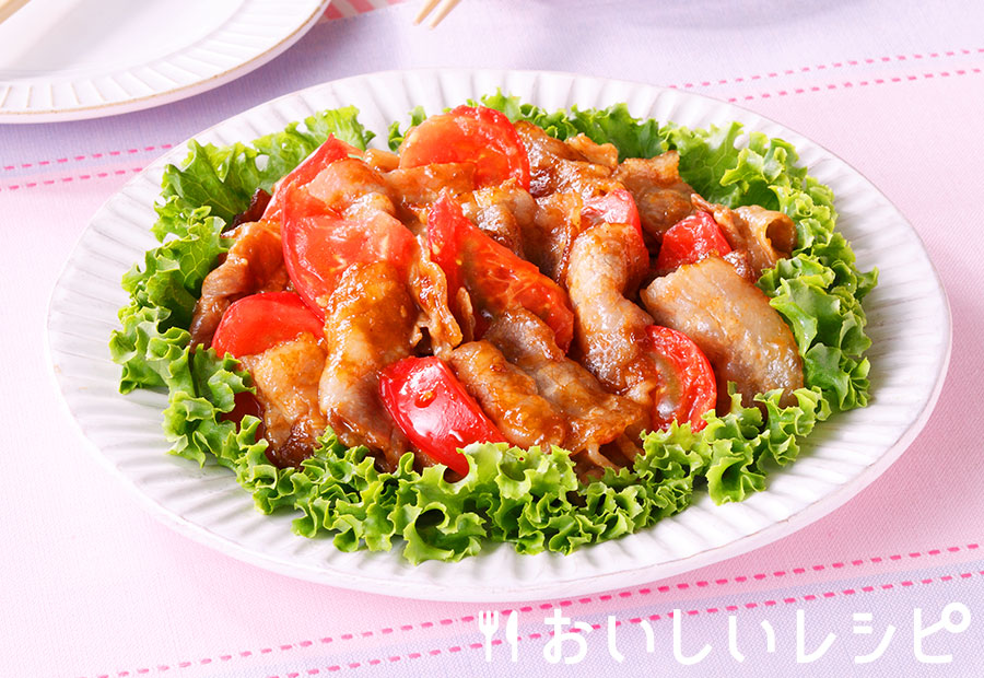 - トマ豚(とん)焼肉トマトの酸味で後味さっぱりな焼肉に。レタスを敷いて、華やかに。