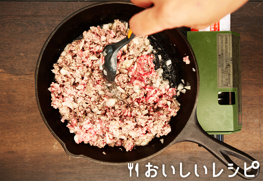 フライパンを熱し、挽き肉とたまねぎを炒めます。