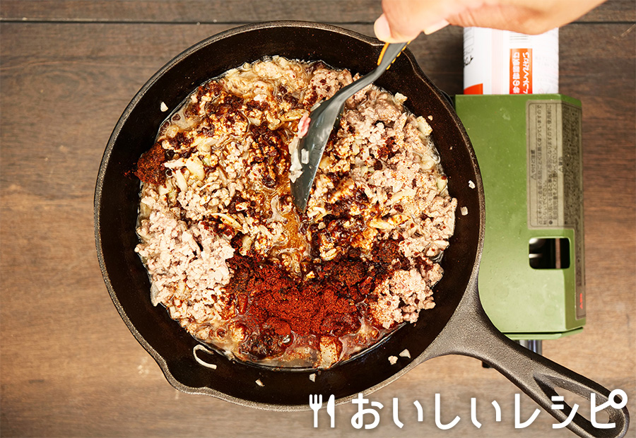 火が通ったら「横濱舶来亭カレーフレーク」・チリパウダー・水を加え、混ぜ合わせながら汁気がなくなるまで煮詰めます。