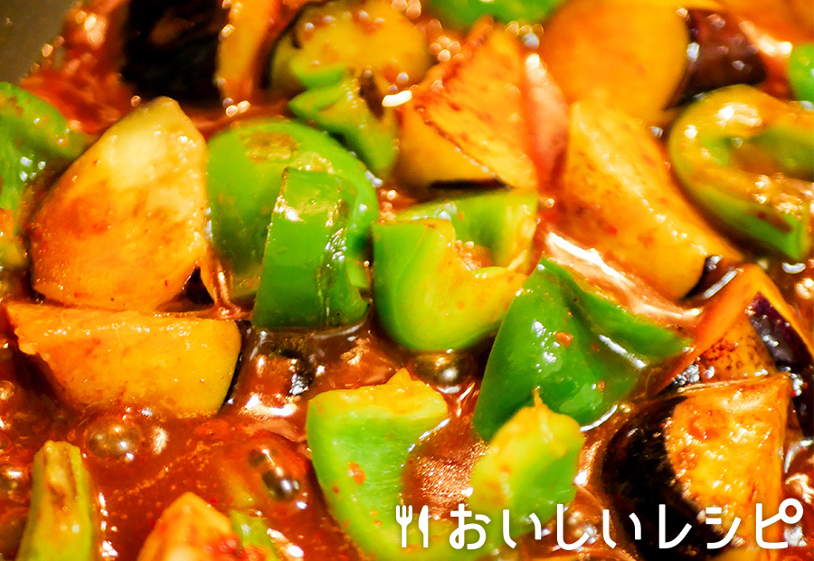2. フライパンに油を熱し、なすとピーマンを炒め、なすに軽く焼き色がついたら一度火を止めて、「プチッと中華」と水を加えて中火にかけます。(※水80mlはポーション容器約2杯分です)
