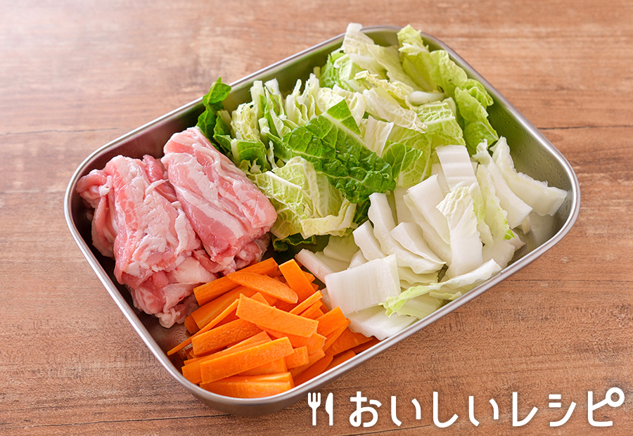 1. 豚肉は一口大に切ります。白菜は芯の部分を1cm幅に、葉の部分を3cm幅に切り、にんじんは短冊切りにします。