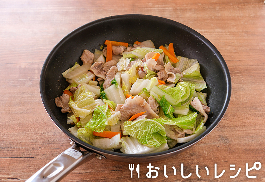 2. フライパンに油を熱し、豚肉・白菜の芯・にんじんを中火で5~6分炒め、しんなりしたら白菜の葉を加えて炒め合わせます。